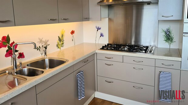 De afbeelding wordt door ons op maat ontworpen specifiek voor jouw keuken. We houden rekening met posities van stopcontacten, schakelaars e.d. en uiteraard met jouw wensen.