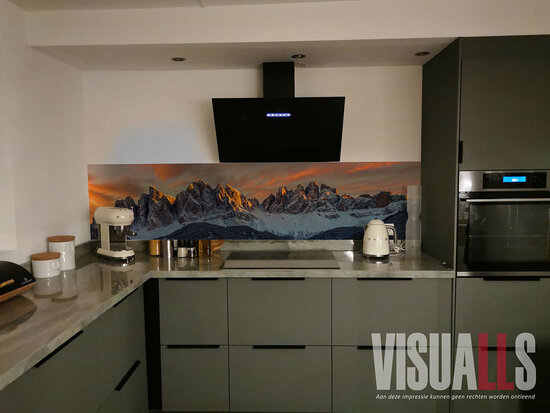 De afbeelding wordt door ons op maat ontworpen specifiek voor jouw keuken. We houden rekening met posities van stopcontacten, schakelaars e.d. en uiteraard met jouw wensen.